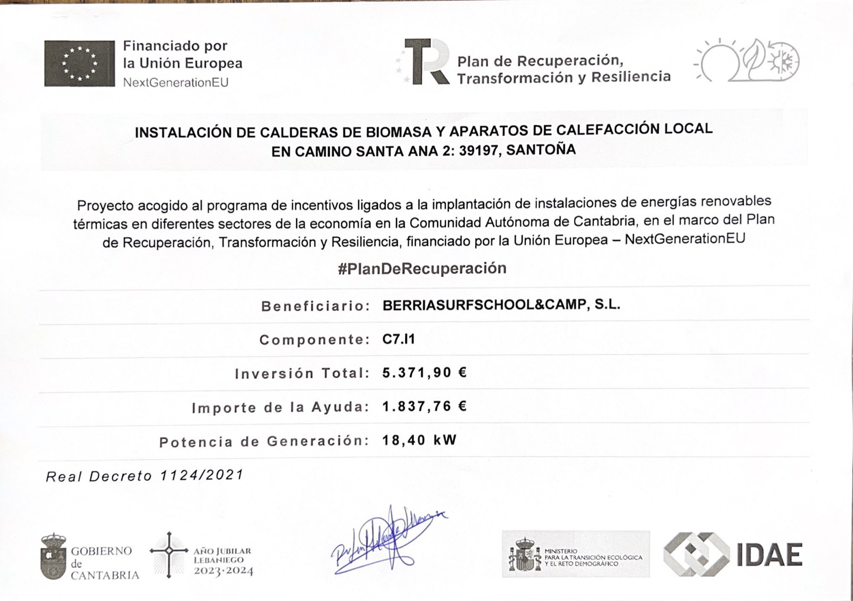 BERRIA SURF CAMP da un paso más en su compromiso con la sostenibilidad implantando una instalación de energía renovable térmica en sus instalaciones. Con una potencia de 18,40 Kw, la instalación proveerá de calefacción a la Escuela de surf y surf camp en Cantabria.